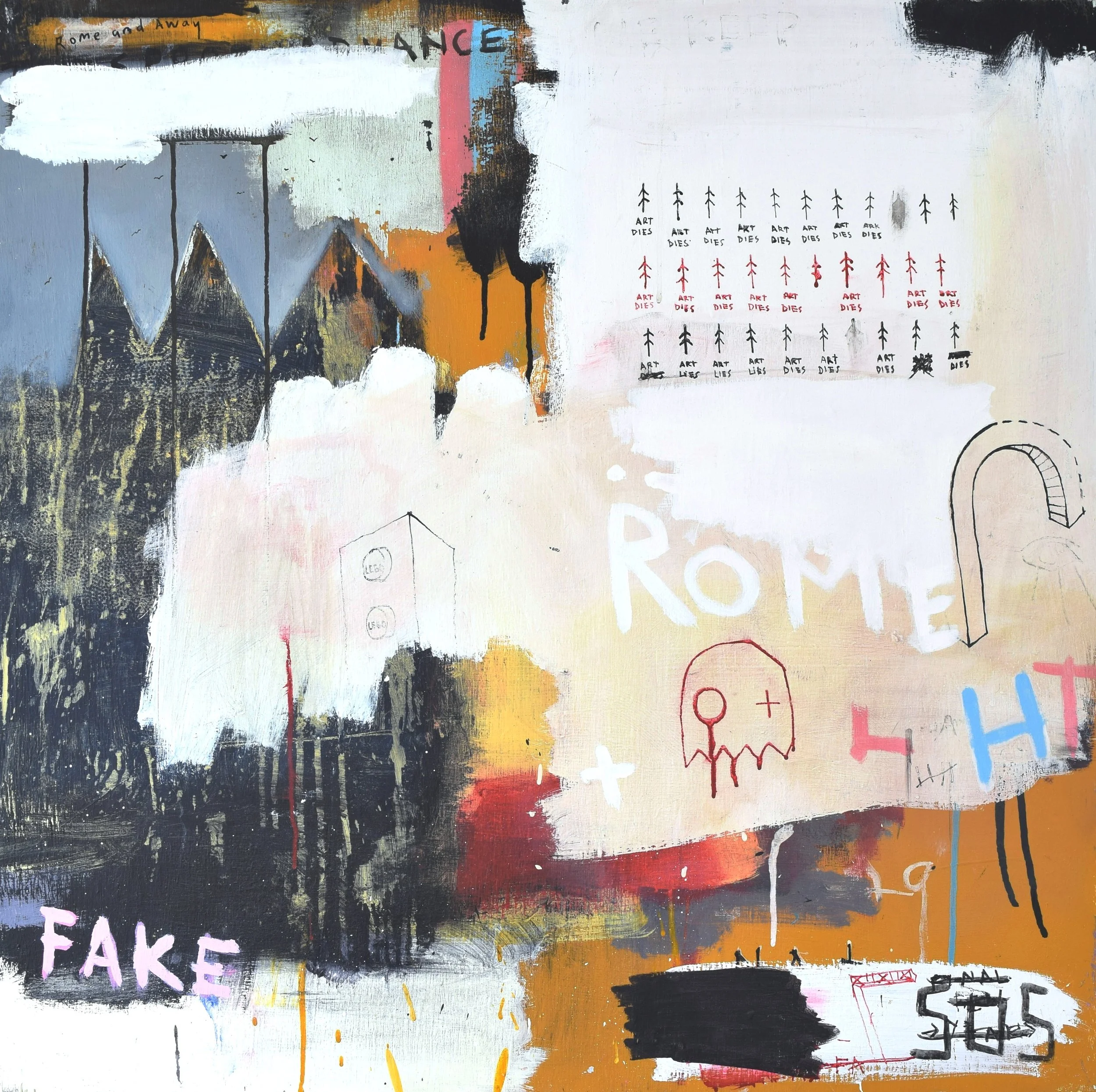 Spray paint, ink, acrylic paint and wax on canvas 100 x 100 x 2 cm