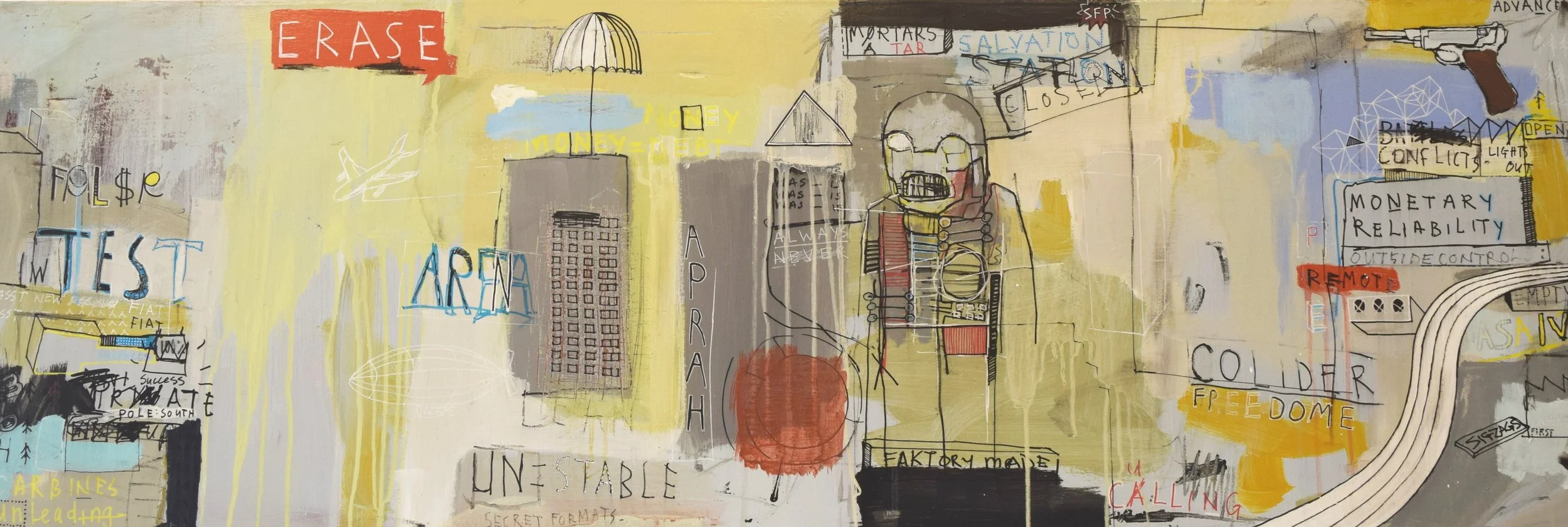Acrylic paint, permanent marker and spray paint on canvas 50 x 150 x 4 cm